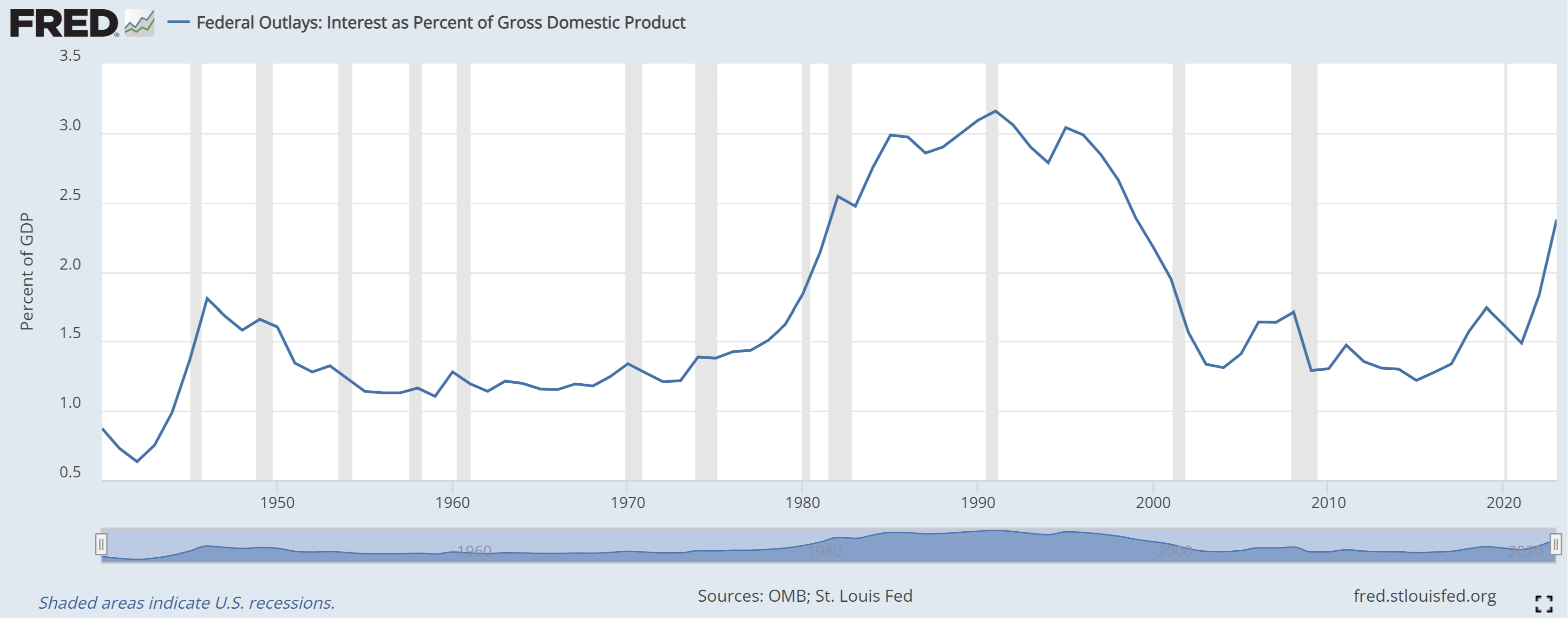 In our office, we created the “Resolute Wall of Infamy” where we have framed the covers of magazines blaring catastrophist headlines over the years (this is a new project - if you haven't seen it yet please stop by!). One entrant comes from Time with the title That Monster Deficit – America’s Economic Black Hole from March 5, 1984. I find it a bit amusing that on that date the interest on the national debt as a percentage of GDP was 2.75% compared to 2.37% today. And for anyone thinking of adjusting their investment policy based on the national debt – the S&P 500 closed at 157.89 on the date of that article. Today it closed at 5,842.47.[iv]