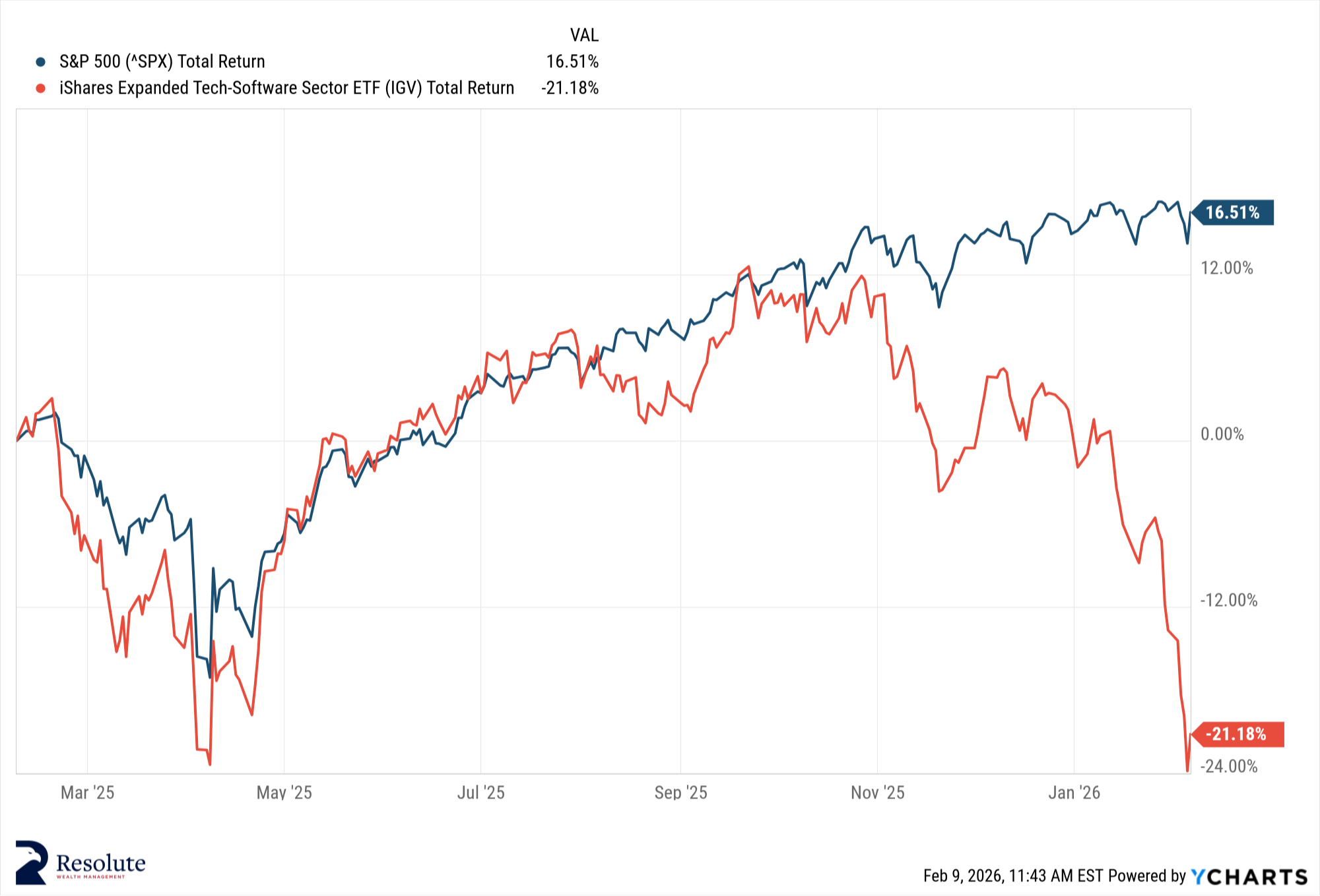 The story changed in January. Here is the S&P 500 (blue line) compared to the SaaS sector ETF (red line) over the last year. See if you can spot when the story changed: