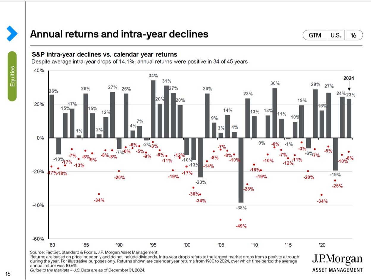 One of our favorite charts at Resolute Wealth Management comes from JP Morgan. It shows how much the market declined from it's high point during the calendar year by the red dots, and the grey bars show the return of the market during that same calendar year. Here it is: