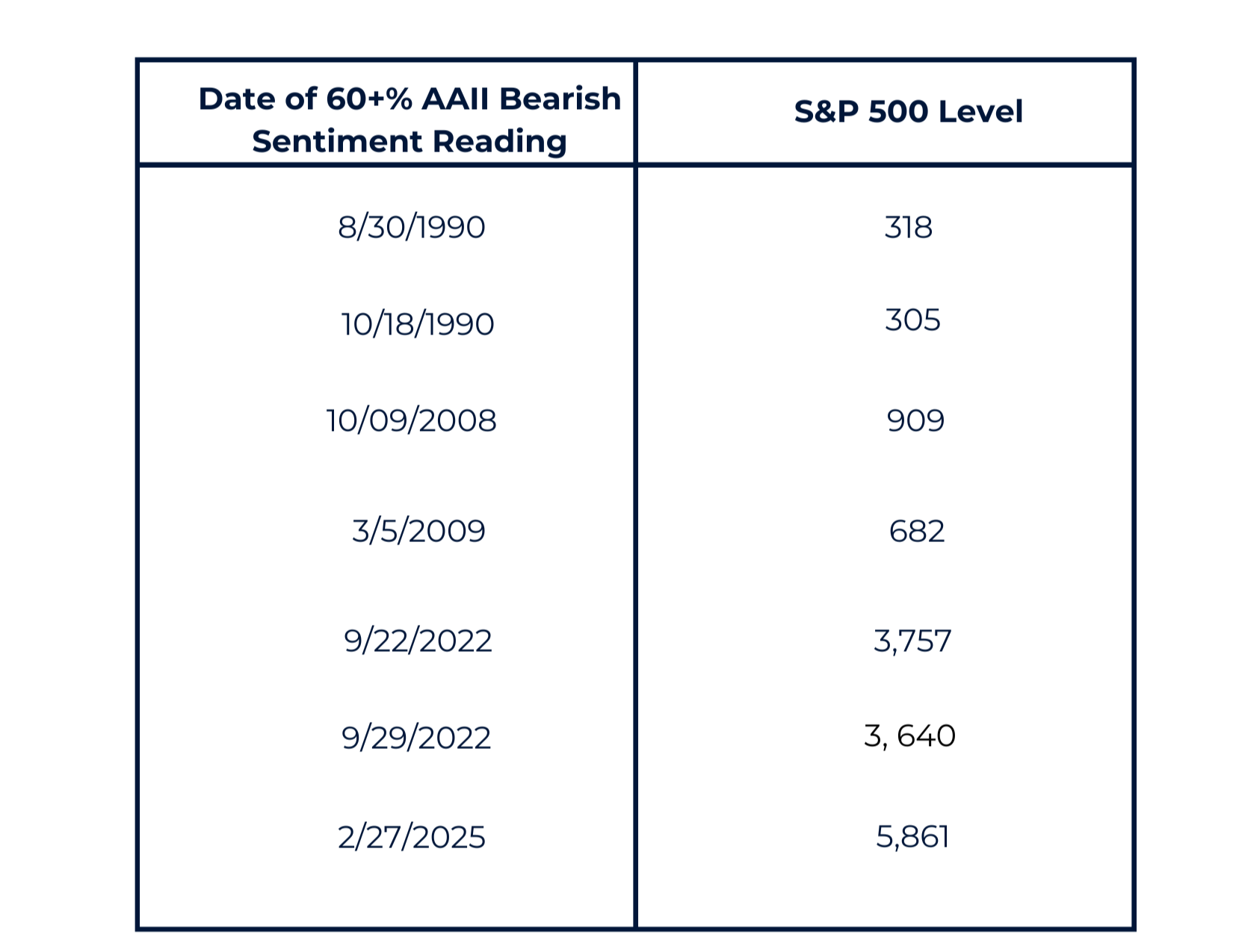 That’s good for the seventh highest reading ever since the survey’s inception in 1987, despite only a three percent drawdown. The only readings that eclipsed February’s latest reading occurred during the 1990 recession and Iraq’s invasion of Kuwait, the 2008 global financial crisis, and the recent 2022 bear market. During the height of the pandemic sell-off in 2020 the survey only peaked at 52% bears! Here’s where the S&P 500 closed the day of the seven highest bearish sentiment readings on record in chronological order: