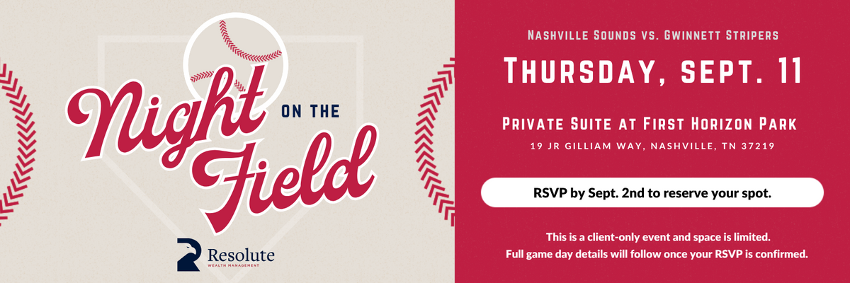Resolute Wealth Management is excited to invite you to a special Client Appreciation Event at the ballpark! Join us in a private suite at First Horizon Park to watch the Nashville Sounds take on the Gwinnett Stripers—we’d love to have you there.