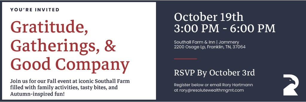 Resolute Wealth Management is inviting you to celebrate the season with us at iconic Southall Farm, where rolling hills and autumn colors set the perfect backdrop.